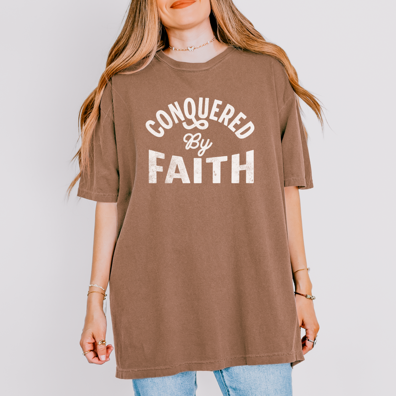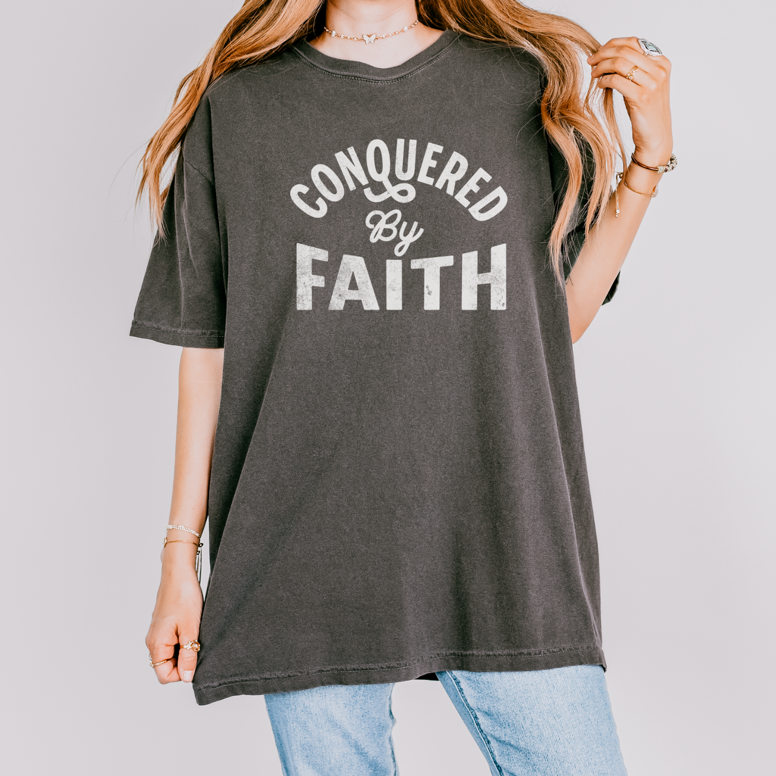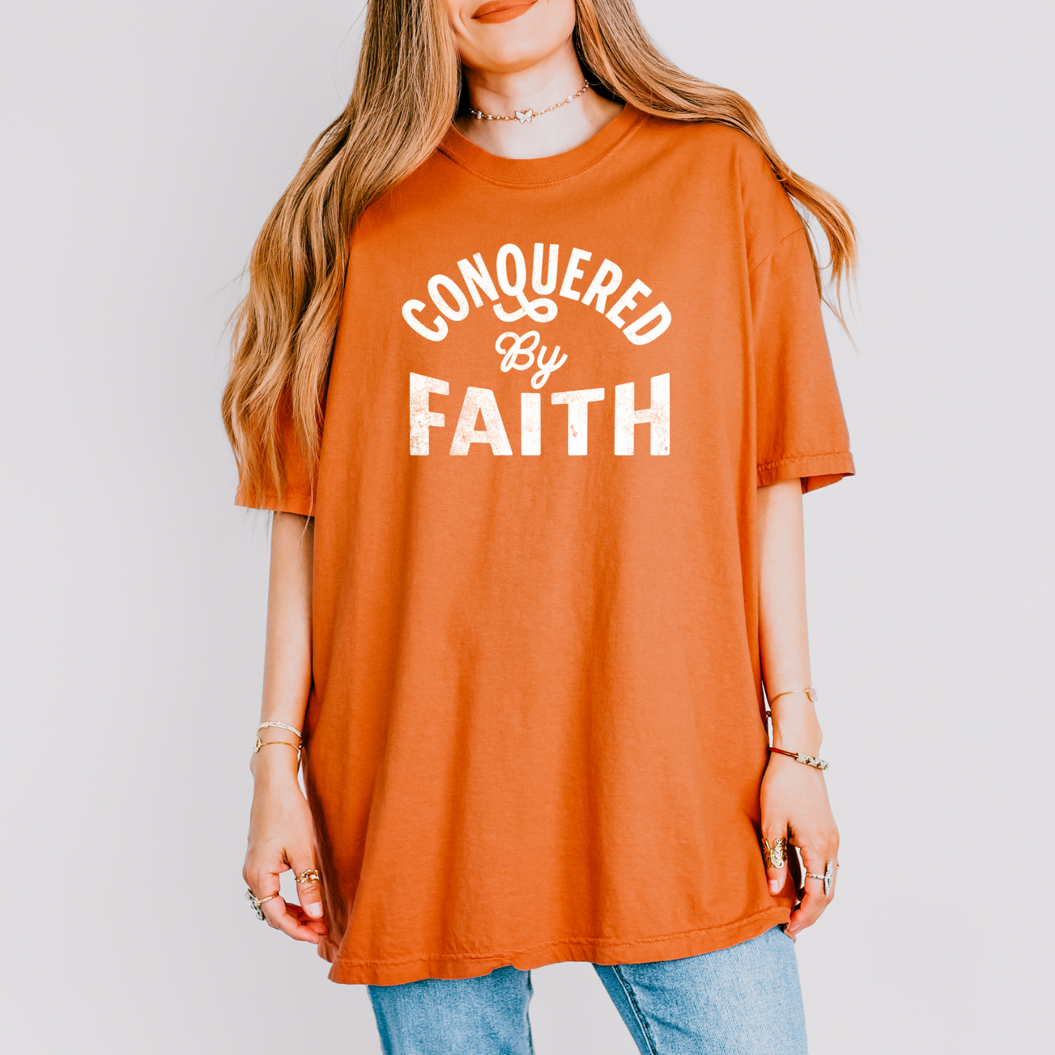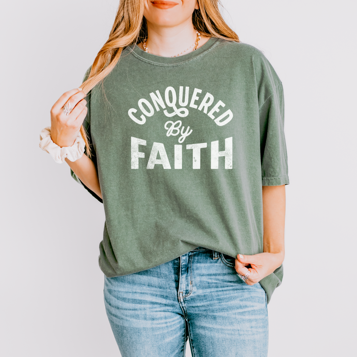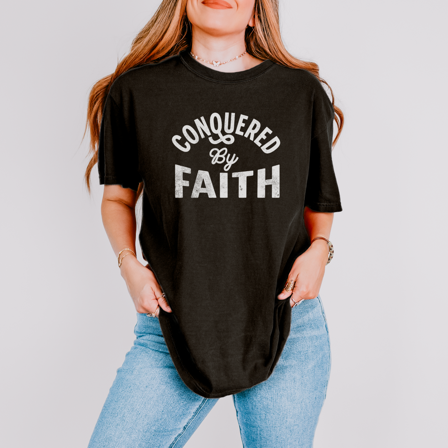Introducing our Conquered by Faith t-shirts, where style meets inspiration!